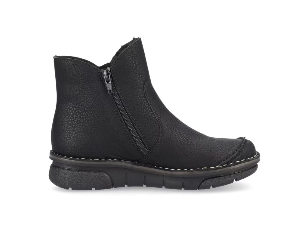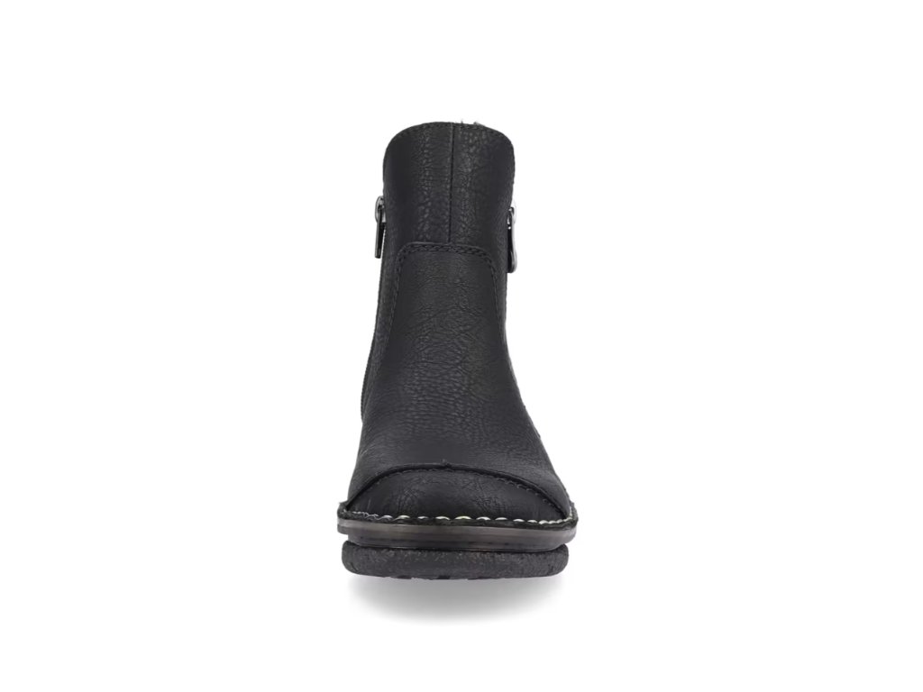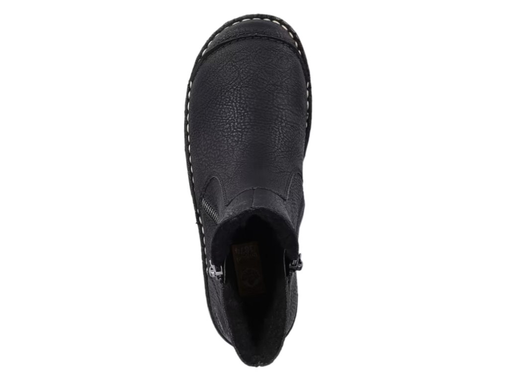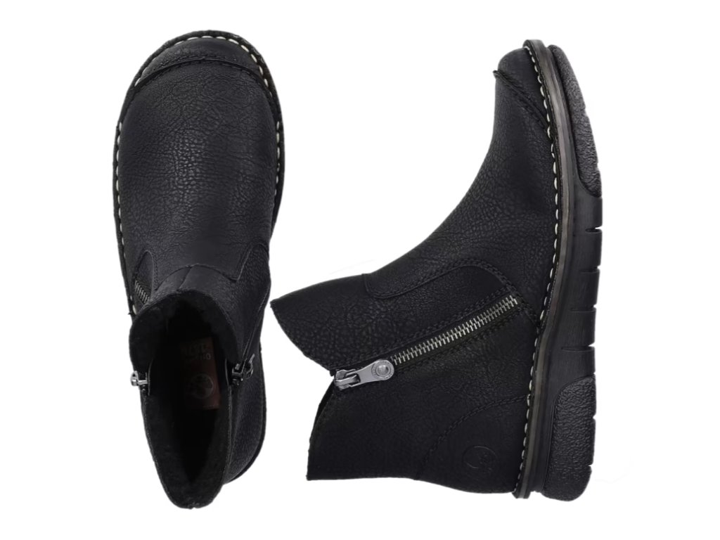 Tyto dámské kotníkové boty značky RIEKER nesmí chybět ve vašem šatníku. Klasický černý svršek je oživen prošívanou přední částí a světlým prošitím podešve, což dodává celkovému vzhledu moderní a stylový design.