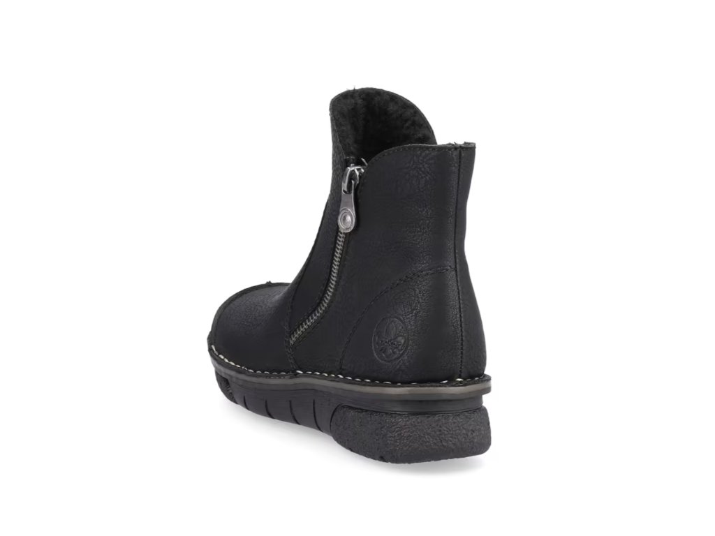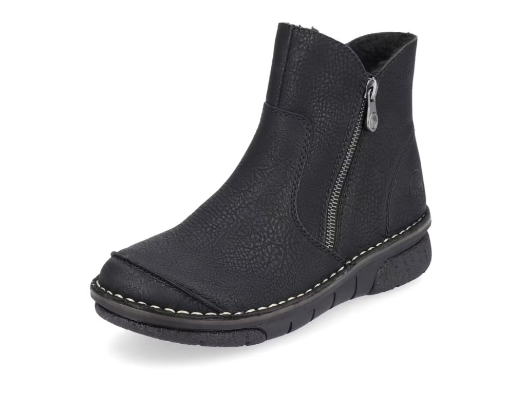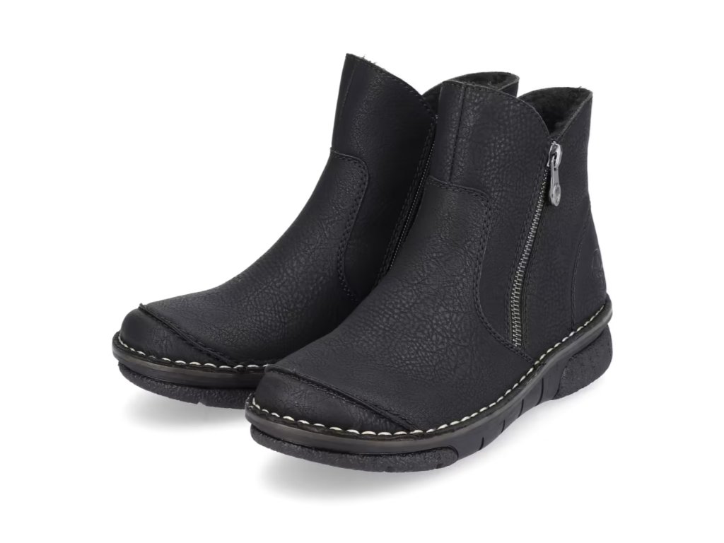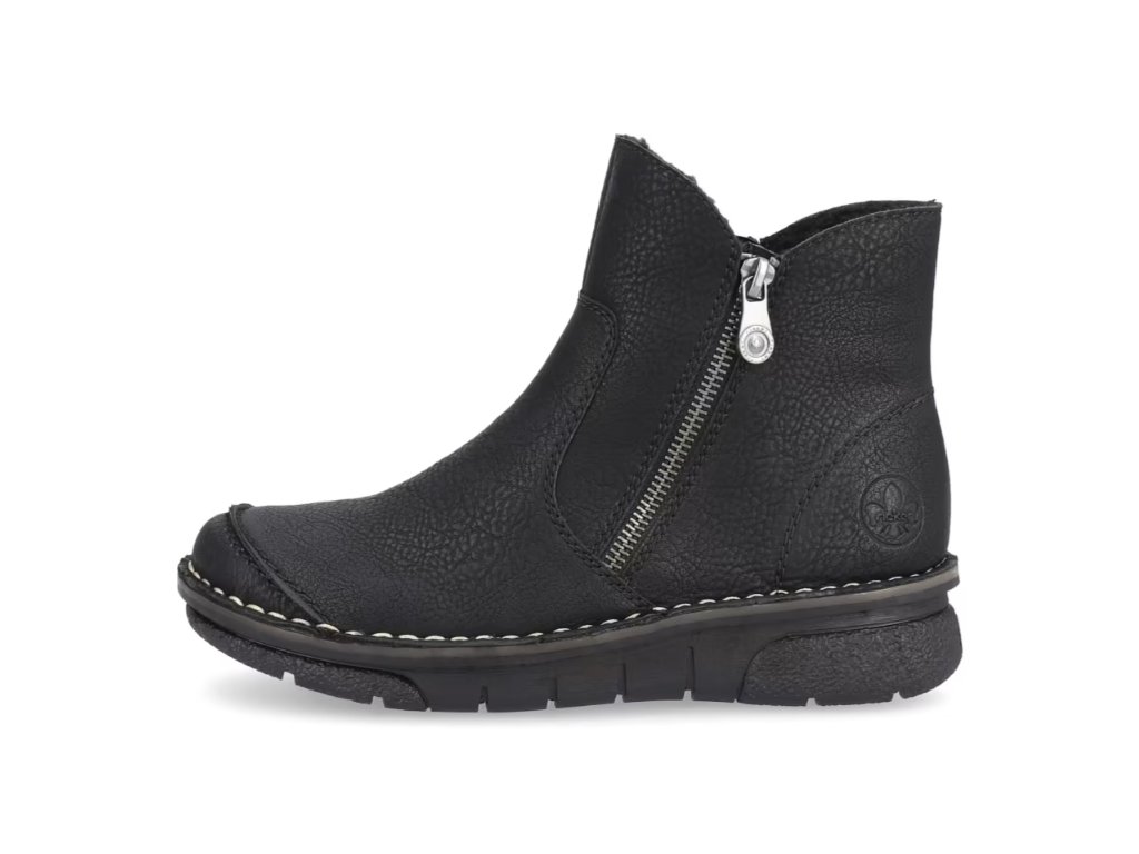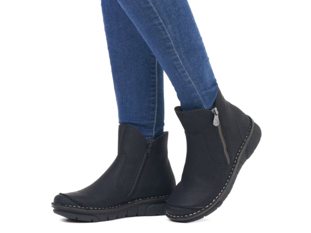 Tyto dámské kotníkové boty značky RIEKER nesmí chybět ve vašem šatníku. Klasický černý svršek je oživen prošívanou přední částí a světlým prošitím podešve, což dodává celkovému vzhledu moderní a stylový design.