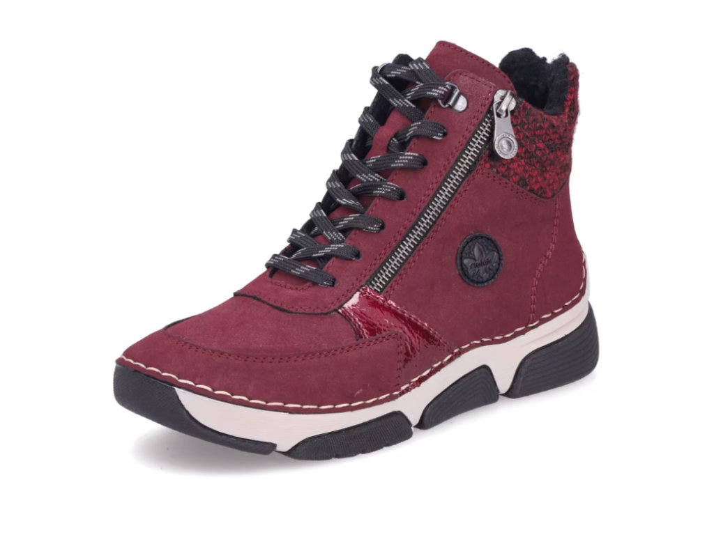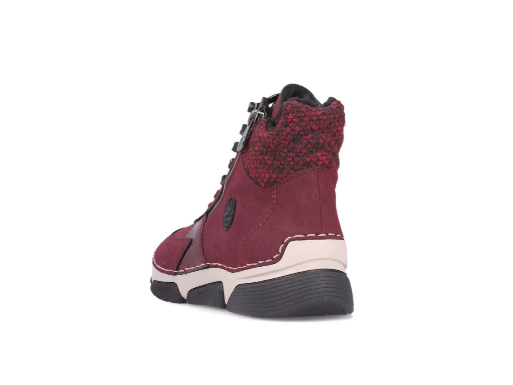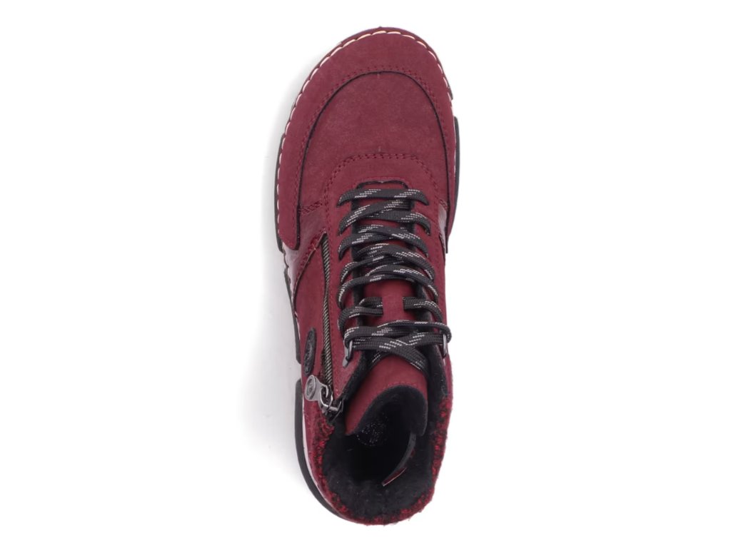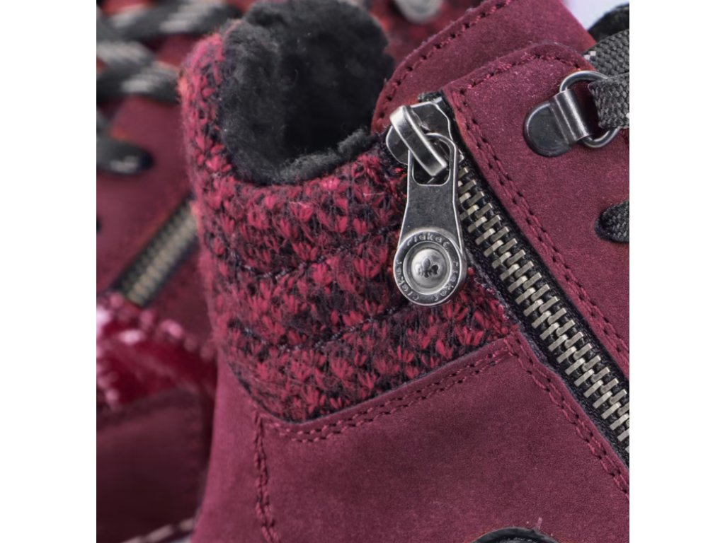 Nepřehlédnutelné kotníkové boty RIEKER zaujmou na první pohled originální kombinací materiálů a nápaditým textilním lemem v horní části. Originální styl dotváří logo značky a praktické šněrování doplněné zipem na nártu, které usnadňují obouvání. Vnitřní hřejivé zateplení ve spojení s koženou stélkou zajišťuje příjemný pocit tepla a komfortu i během chladných dní. Designově propracovaná podešev nejen skvěle vypadá, ale díky tlumící technologii výrazně zvyšuje pohodlí při každém kroku. Ideální volba pro ženy, které hledají stylovou obuv bez kompromisů.