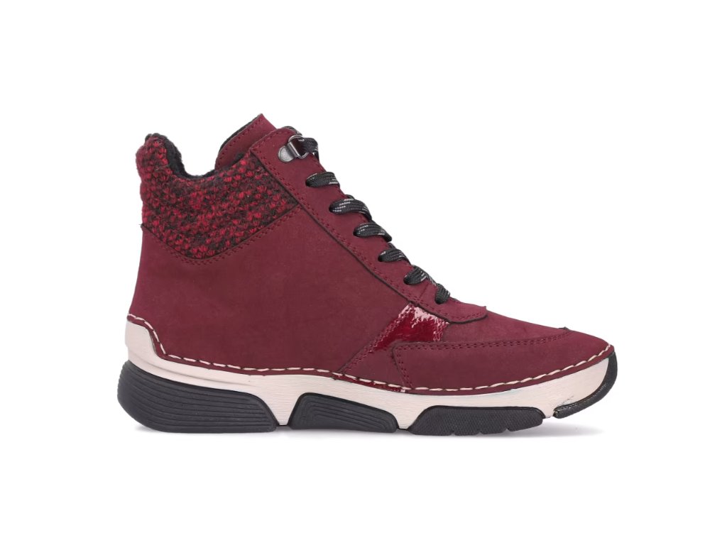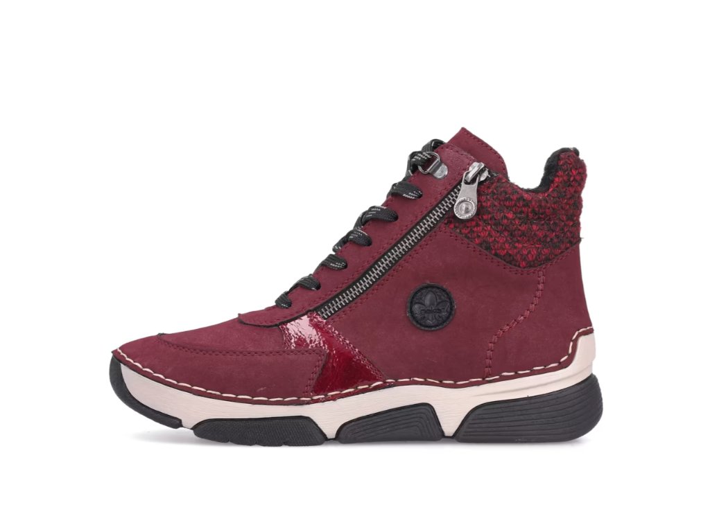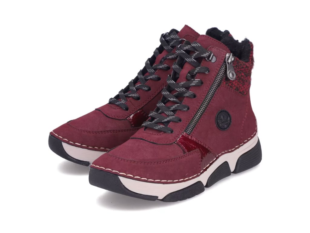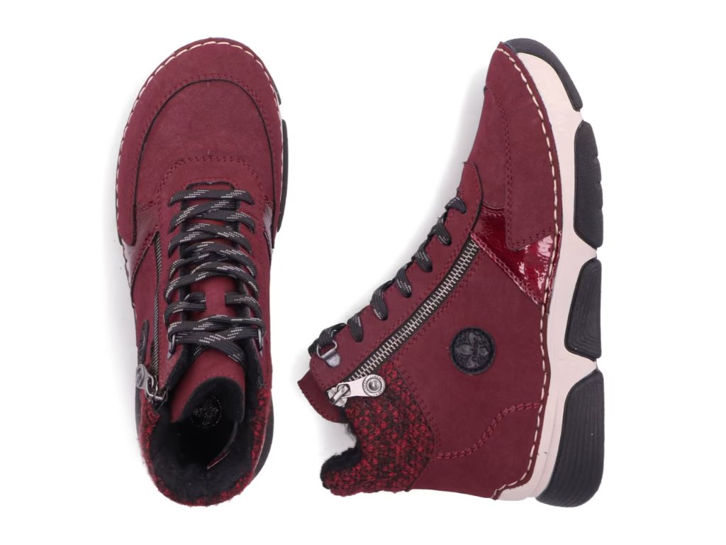 Nepřehlédnutelné kotníkové boty RIEKER zaujmou na první pohled originální kombinací materiálů a nápaditým textilním lemem v horní části. Originální styl dotváří logo značky a praktické šněrování doplněné zipem na nártu, které usnadňují obouvání. Vnitřní hřejivé zateplení ve spojení s koženou stélkou zajišťuje příjemný pocit tepla a komfortu i během chladných dní. Designově propracovaná podešev nejen skvěle vypadá, ale díky tlumící technologii výrazně zvyšuje pohodlí při každém kroku. Ideální volba pro ženy, které hledají stylovou obuv bez kompromisů.
