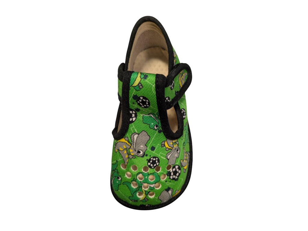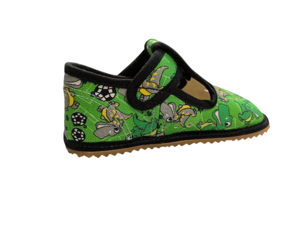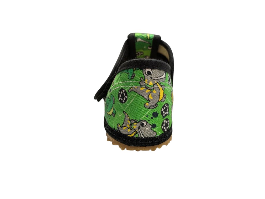 Dětské barefoot bačkory BEDA GREEN DINOBALL - pevný opatek, perforované