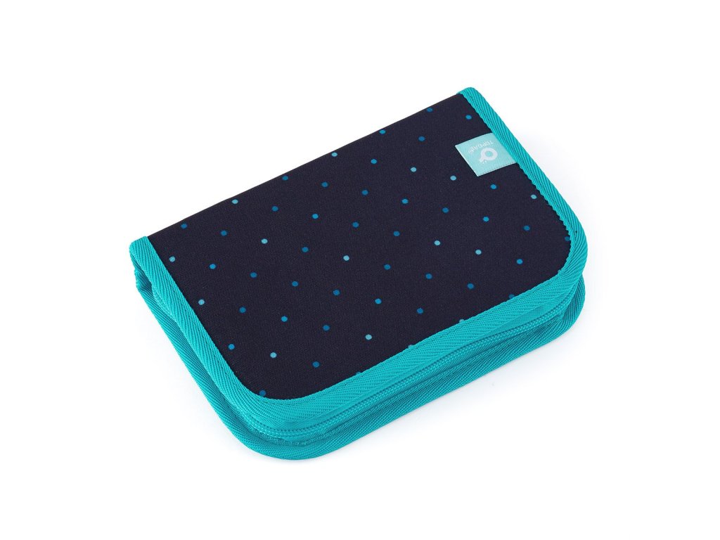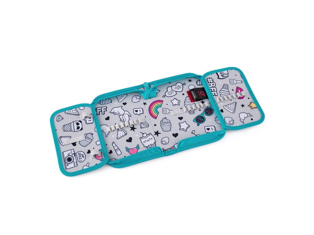 Jednopatrové školní pouzdro se dvěma klopami. Díky gumovým úchytům se do nich vejde celkem 21 pastelek, tužek a fixek. Tři širší úchyty poslouží na pravítko, kružítko či nůžky. Dva větší na gumu a ořezávátko.