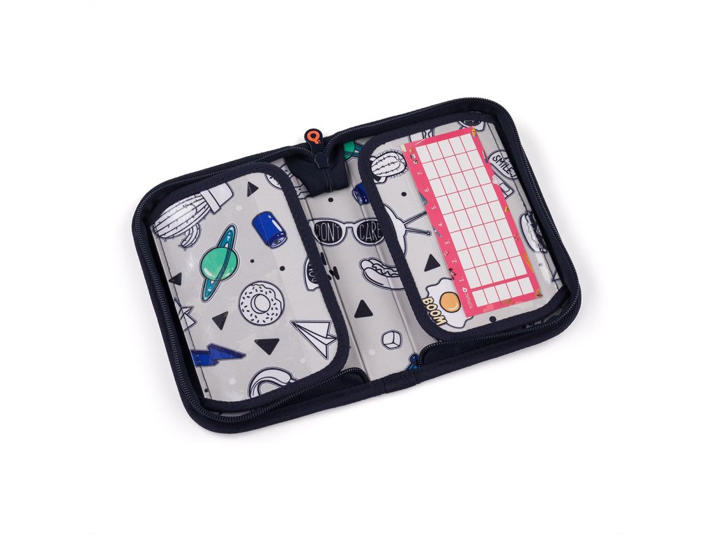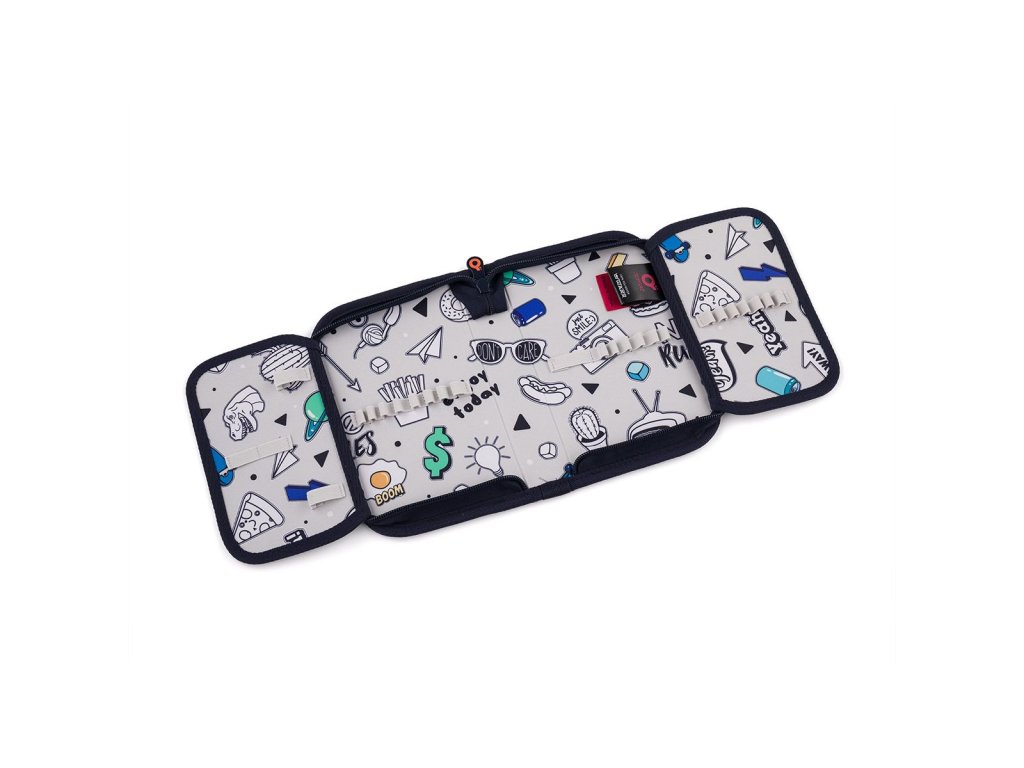 Jednopatrové školní pouzdro se dvěma klopami. Díky gumovým úchytům se do nich vejde celkem 21 pastelek, tužek a fixek. Tři širší úchyty poslouží na pravítko, kružítko či nůžky. Dva větší na gumu a ořezávátko.