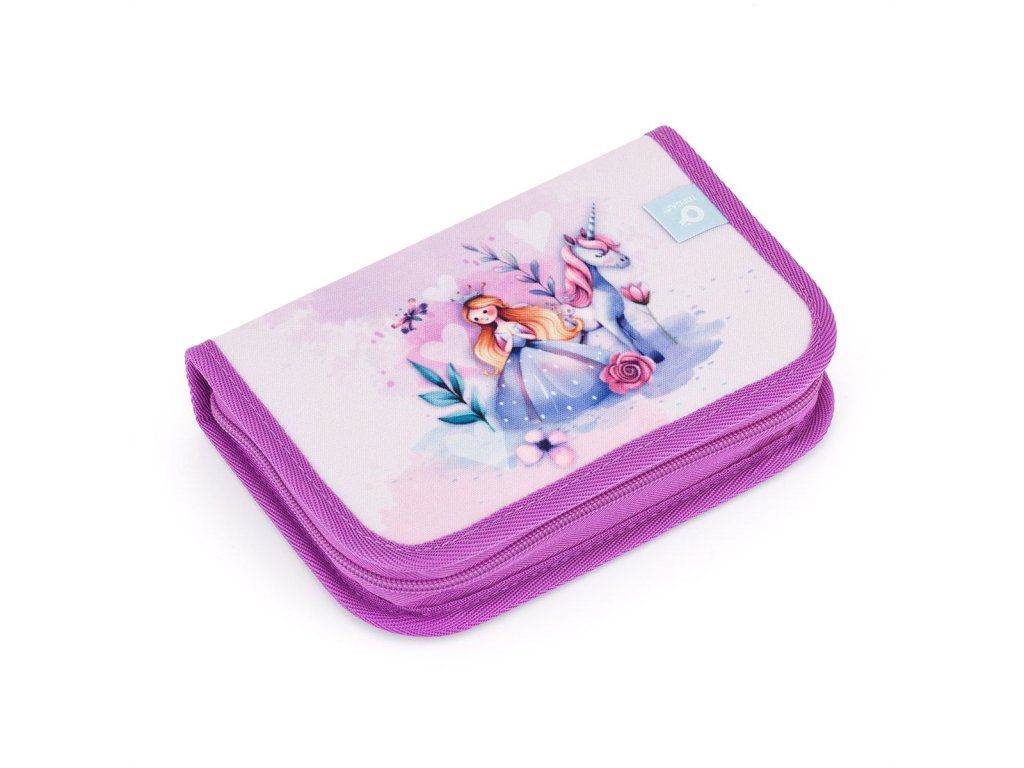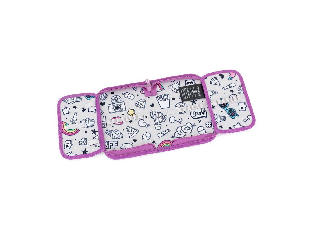 Jednopatrové školní pouzdro se dvěma klopami. Díky gumovým úchytům se do nich vejde celkem 21 pastelek, tužek a fixek. Tři širší úchyty poslouží na pravítko, kružítko či nůžky. Dva větší na gumu a ořezávátko.