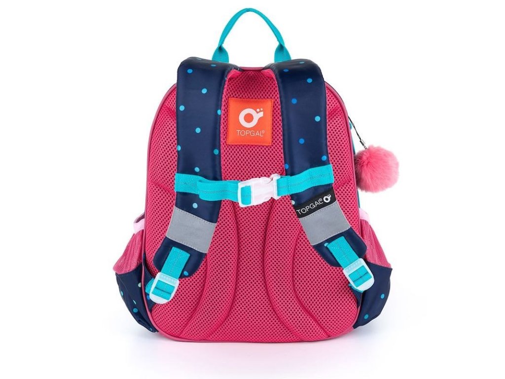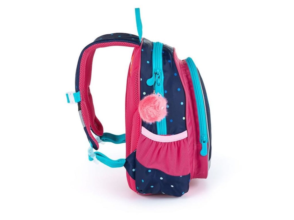 Samozřejmostí jsou reflexní prvky, polstrovaná záda a pohodlné polstrované ramenní popruhy. Jako bonus má taháček s přívěskem chlupatou bambulkou.
