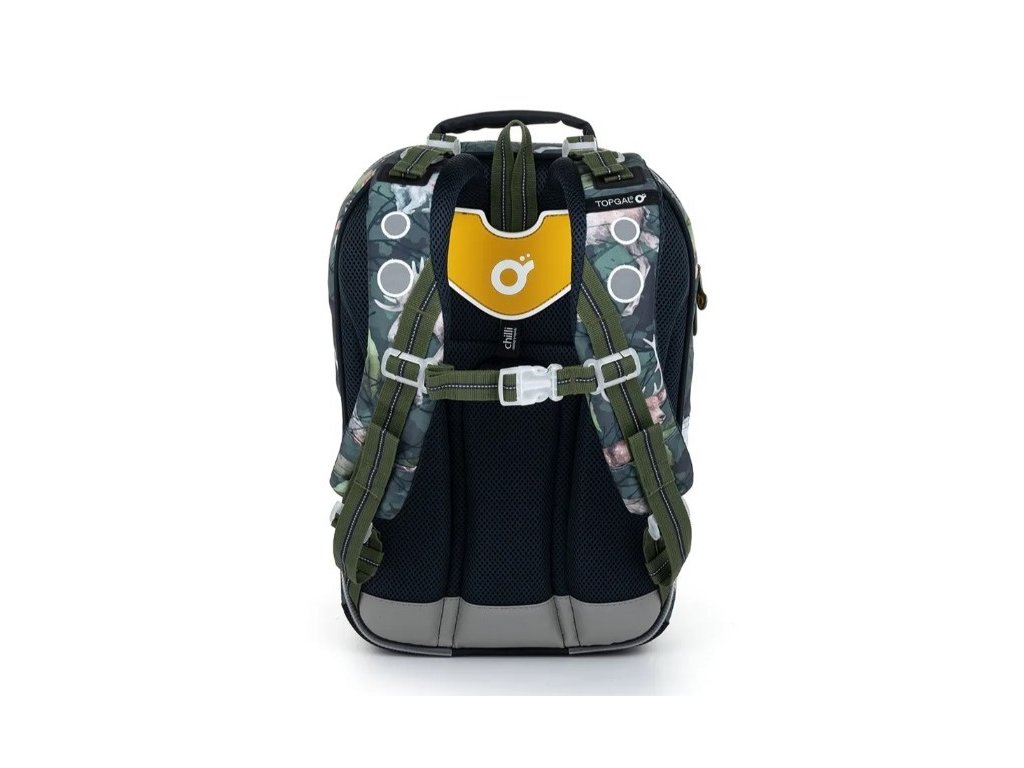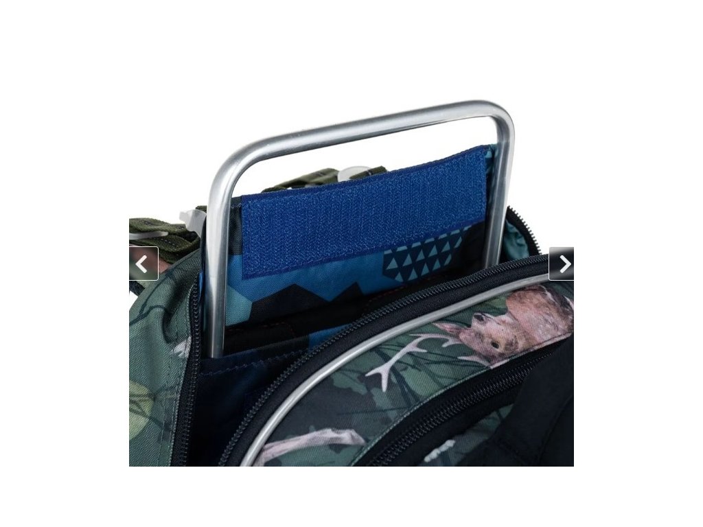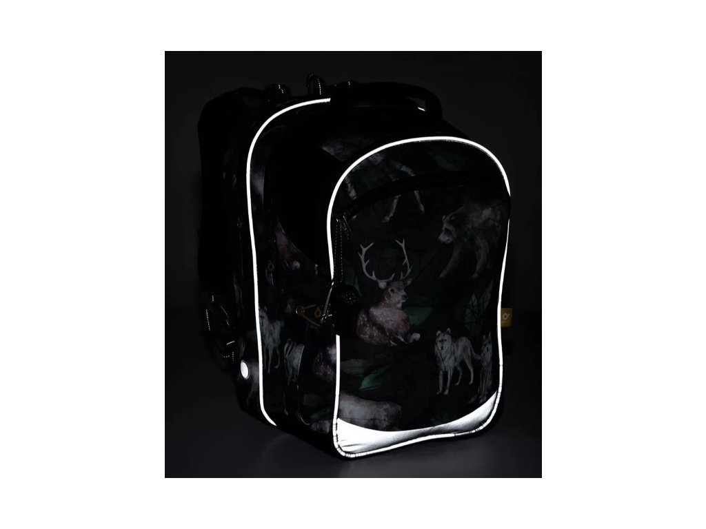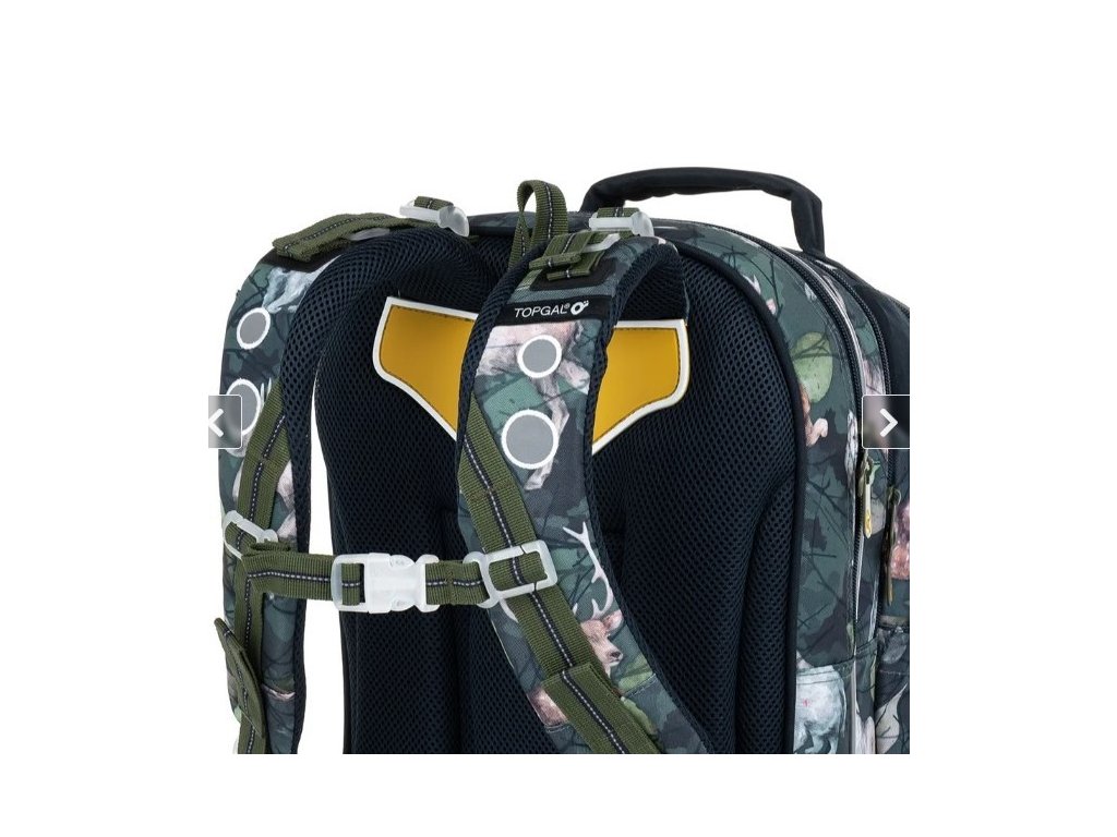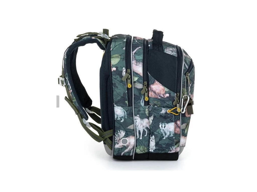 Tříkomorový školní batoh Topgal, motiv lesní zvěř, jako přívěsek je píšťalka s kompasem a karabina.