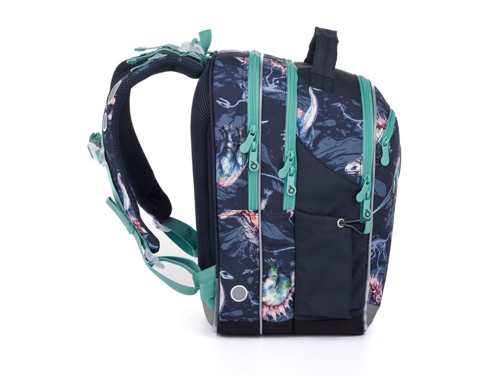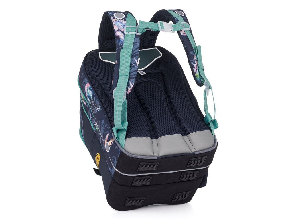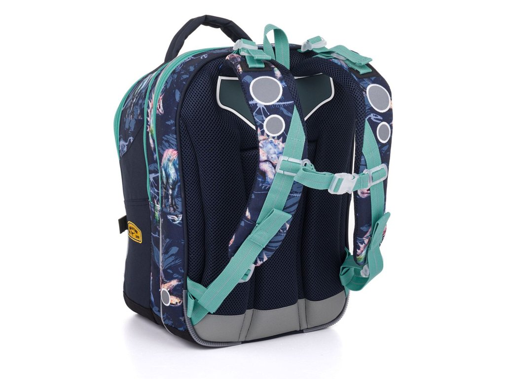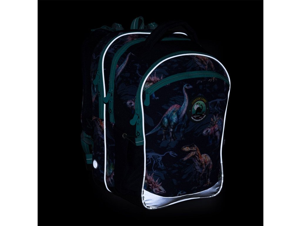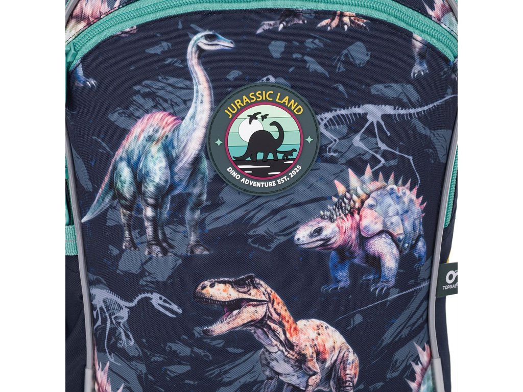 Tříkomorový tmavý batoh s dinosaury doporučujeme pro chlapce s výškou od 120 cm. Tentokrát nechybí ani stylová gumová nášivka. Praktickou tmavou barvou oživí zelené doplňky a naše ikonické zipy.