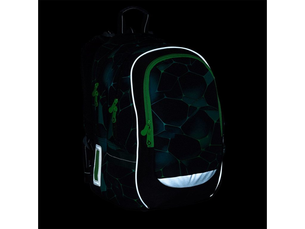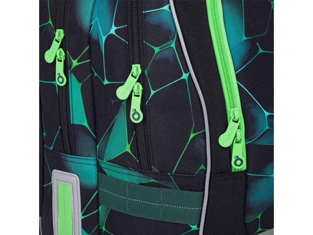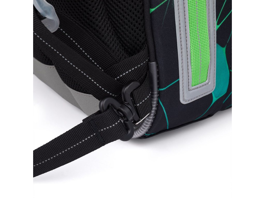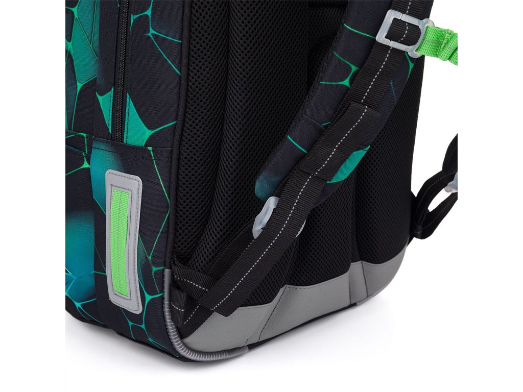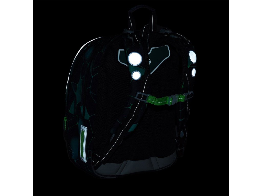 Dvoukomorový školní batoh se zelenými prvky je vhodný pro školáky s výškou od 125 cm. Decentní tmavý podklad oživí zelené prvky a stejně zelené taháčky zipu.