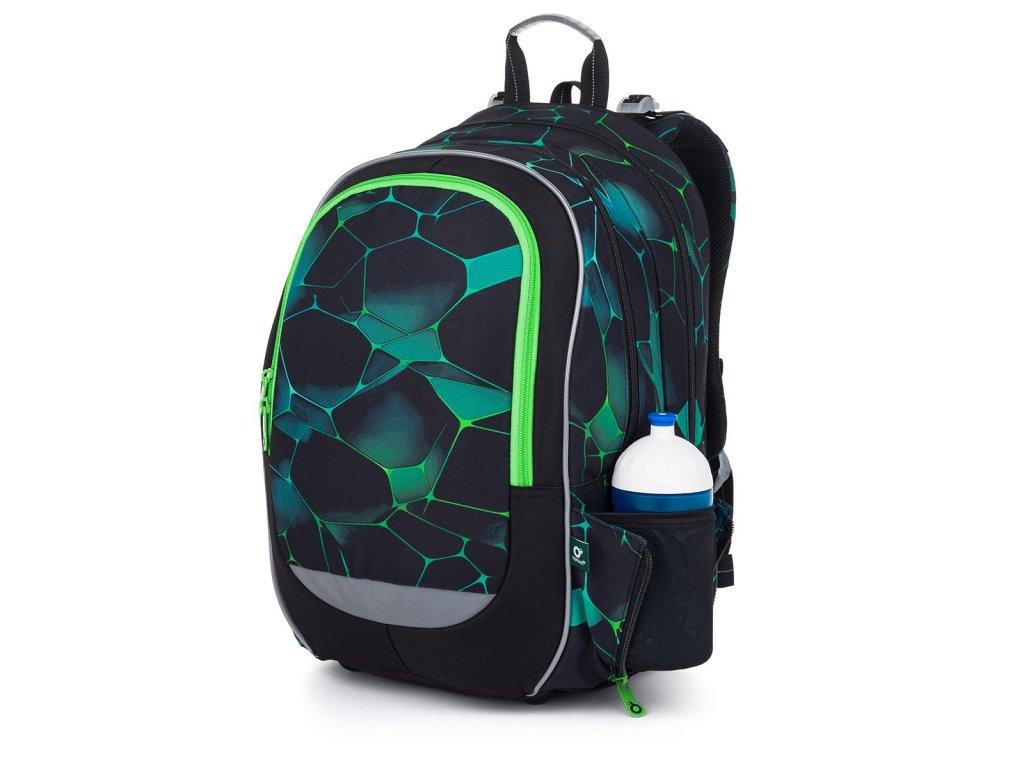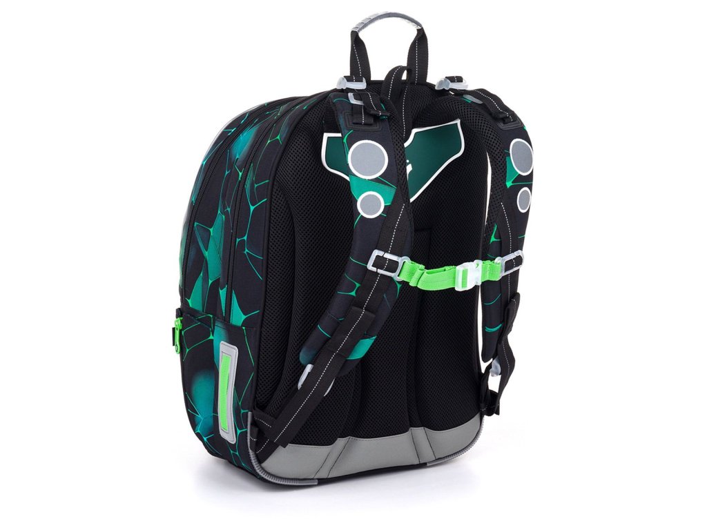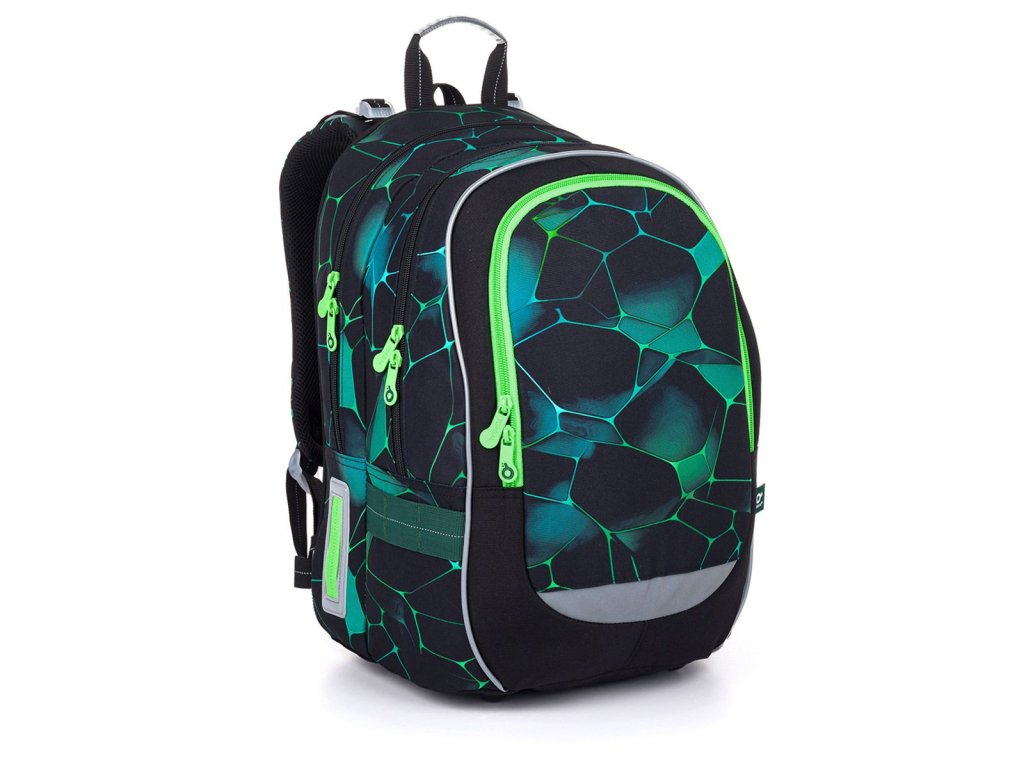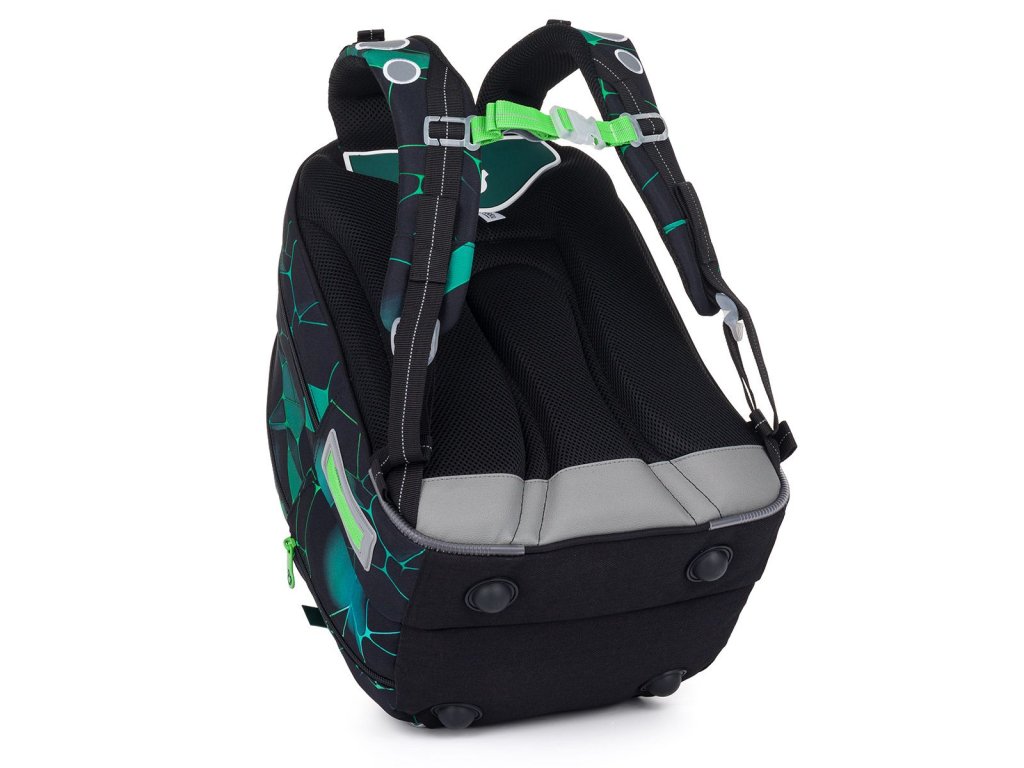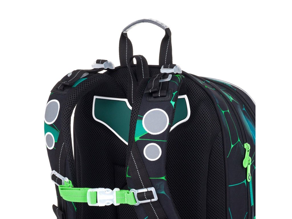 Dvoukomorový školní batoh se zelenými prvky je vhodný pro školáky s výškou od 125 cm. Decentní tmavý podklad oživí zelené prvky a stejně zelené taháčky zipu.