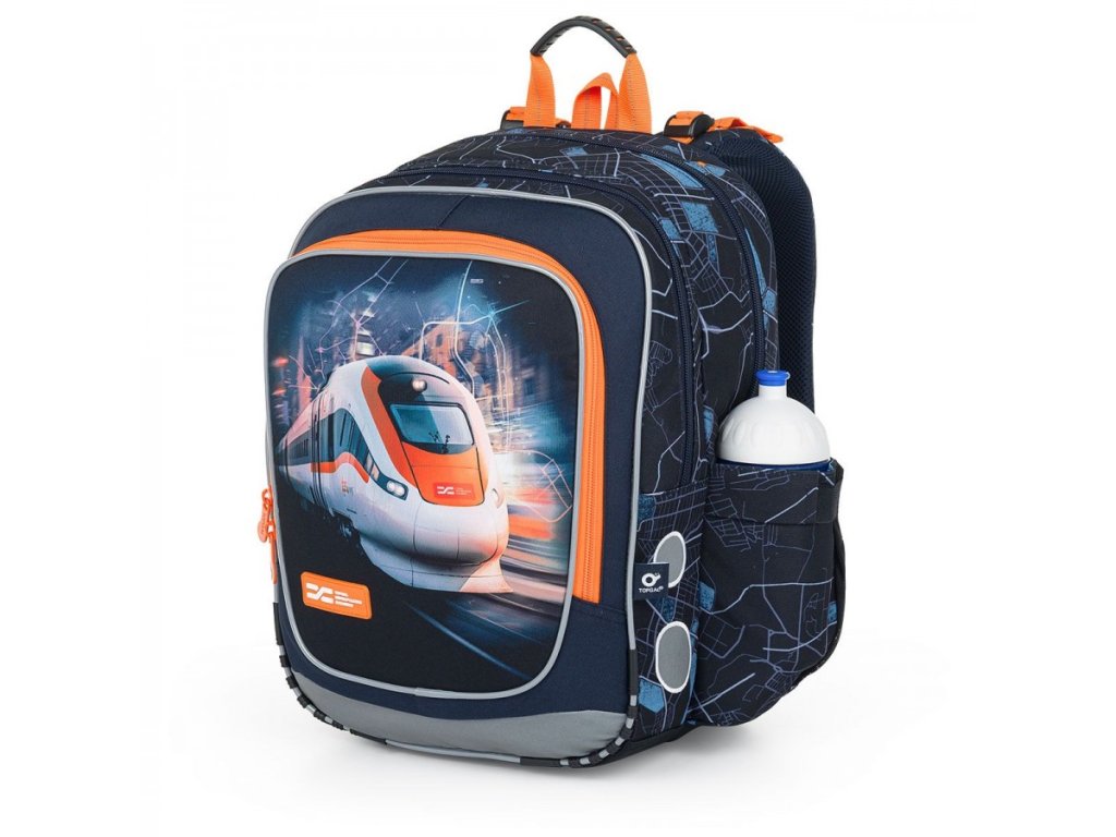 Ultarlehký dvoukomorový školní batoh Topgal nejen pro drobné prvňáčky s motivem rychlovlaku. Praktický tmavomodrý batoh vhodný pro všechny strojvůdce od 110 cm.