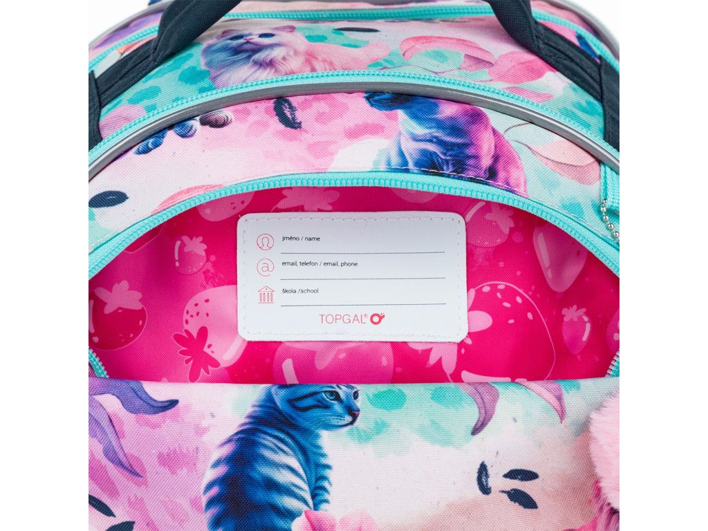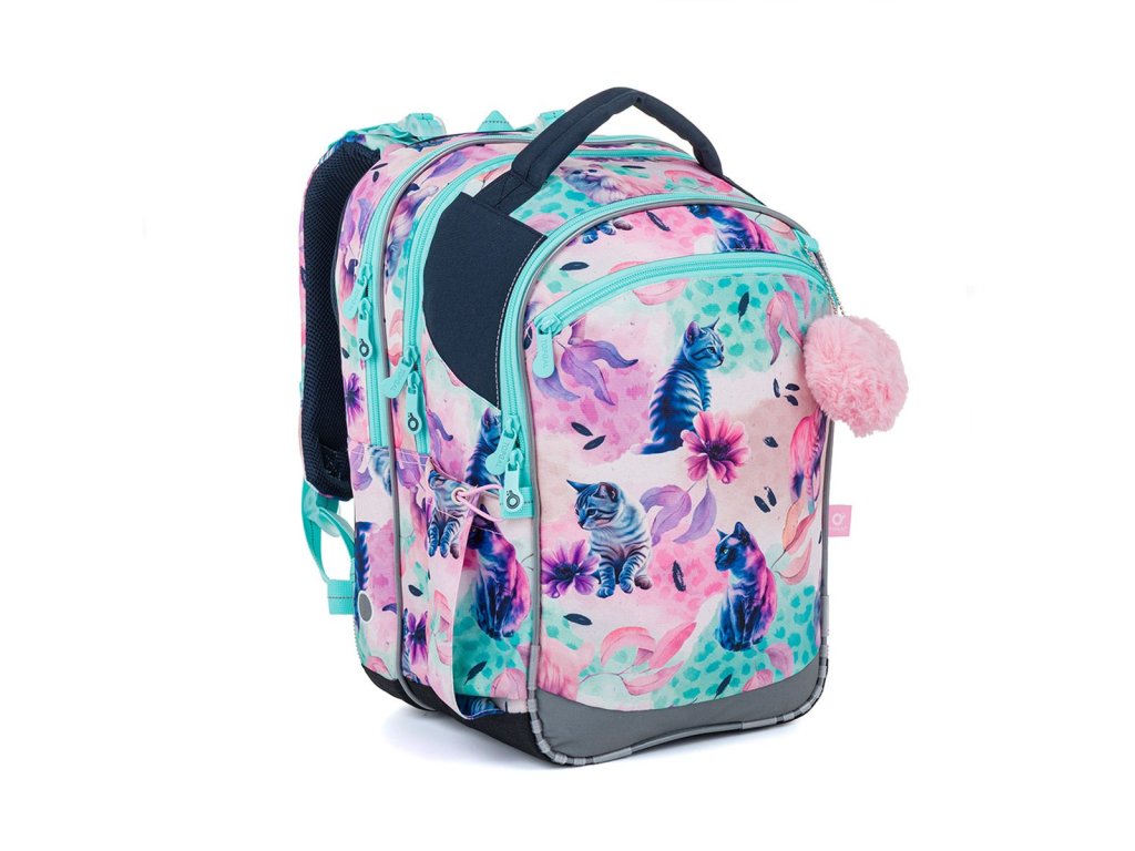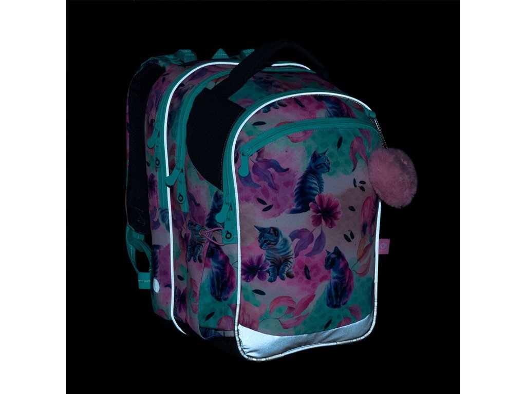Tříkomorový batoh s koťátky doporučujeme pro slečny s výškou od 120 cm. Celkový design podtrhne třpytivý přívěsek ve tvaru srdce.