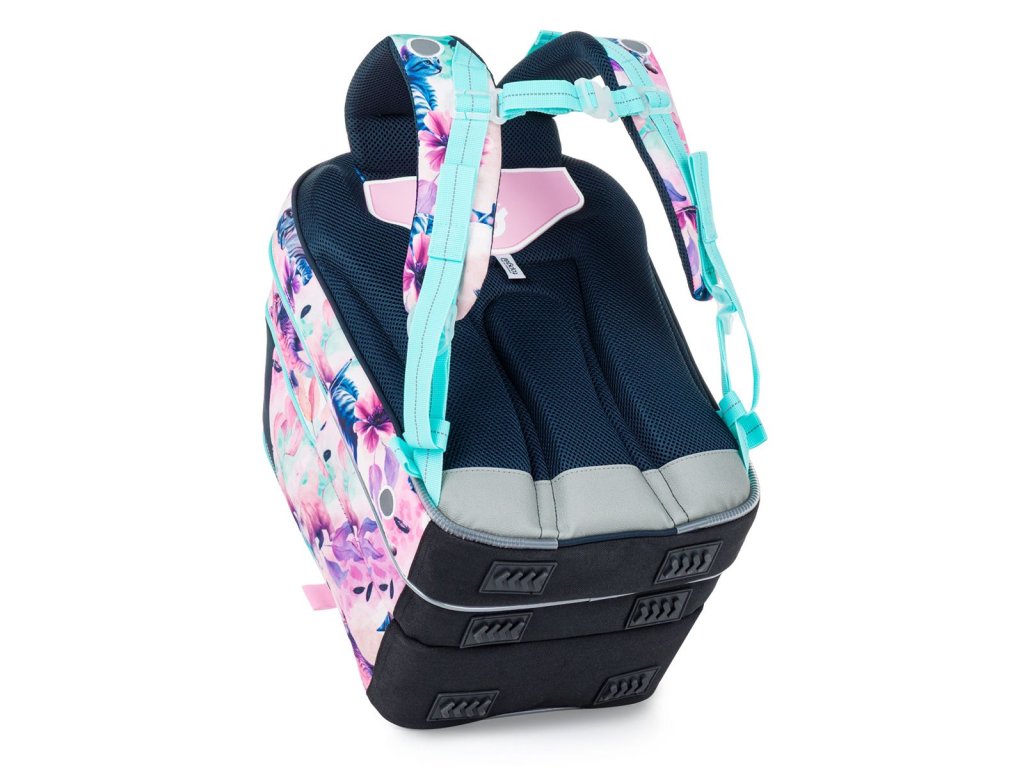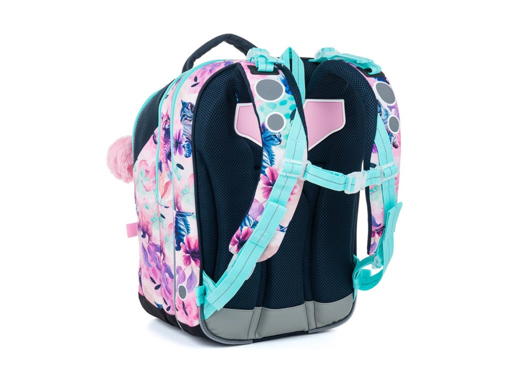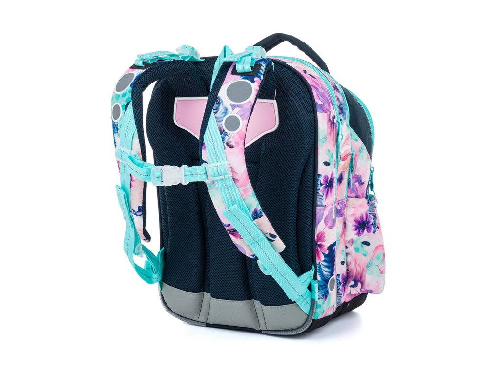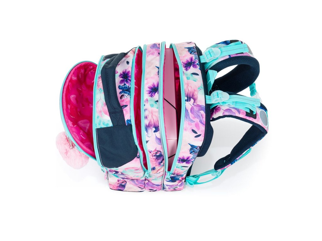 Zadní komora je nejširší, sem doporučujeme dát nejtěžší učebnice nebo desky na sešity. Přední komora je o něco užší a je v ní umístěna ještě malá síťová kapsa na zip a jmenovka.