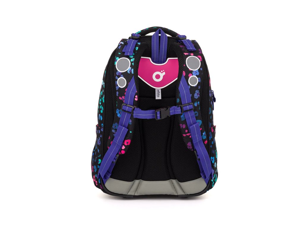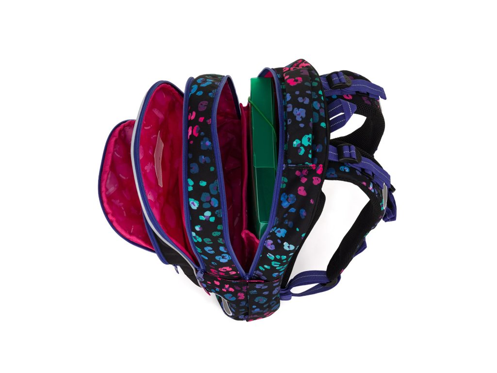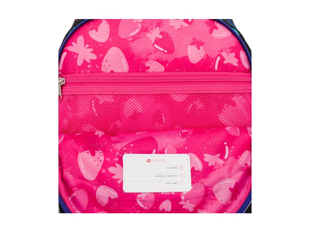V zadní komoře najdete praktický organizér na učebnice a sešity. Přední komora je vybavena síťovanou kapsou na zip a jmenovkou – ideální na krabičku se svačinou nebo penál 25074 ve stejném designu. Batoh LORI má také dvě postranní kapsy na pití, do kterých se pohodlně vejde například Zdravá lahev