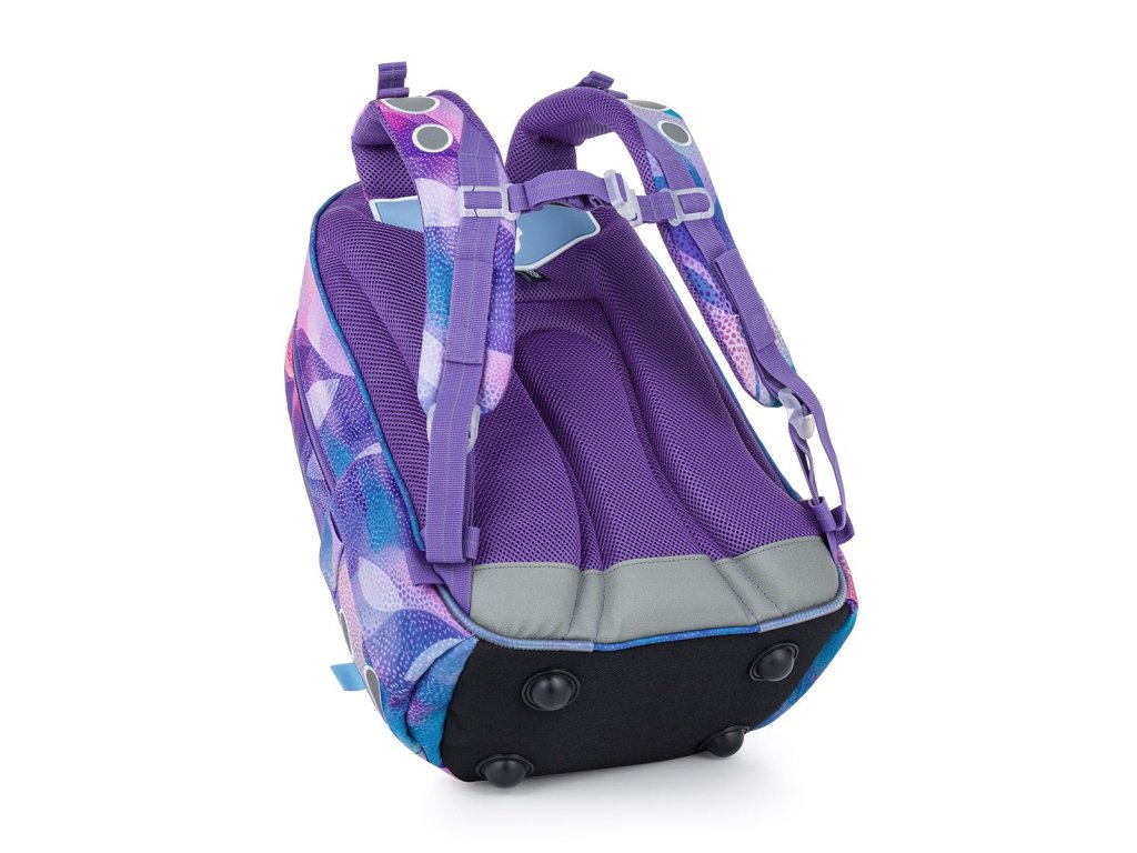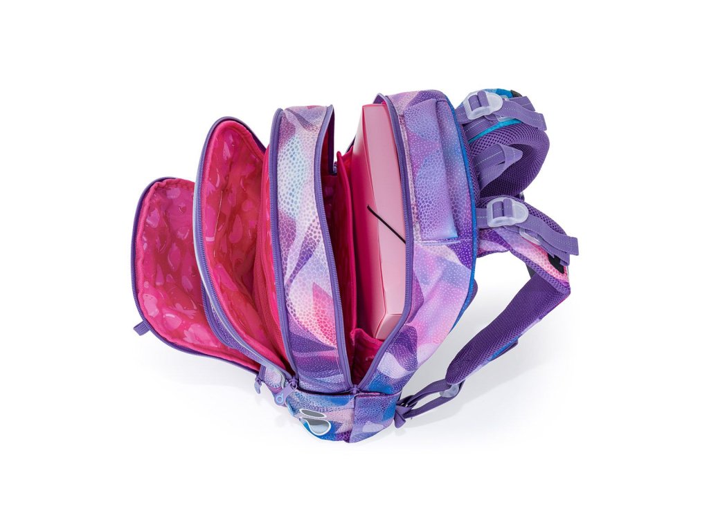 V zadní komoře najdete praktický organizér na učebnice a sešity. Přední komora je vybavena síťovanou kapsou na zip a jmenovkou – ideální na krabičku se svačinou nebo penál 25008 ve stejném designu. Batoh LORI má také dvě postranní kapsy na pití, do kterých se pohodlně vejde například Zdravá lahev
