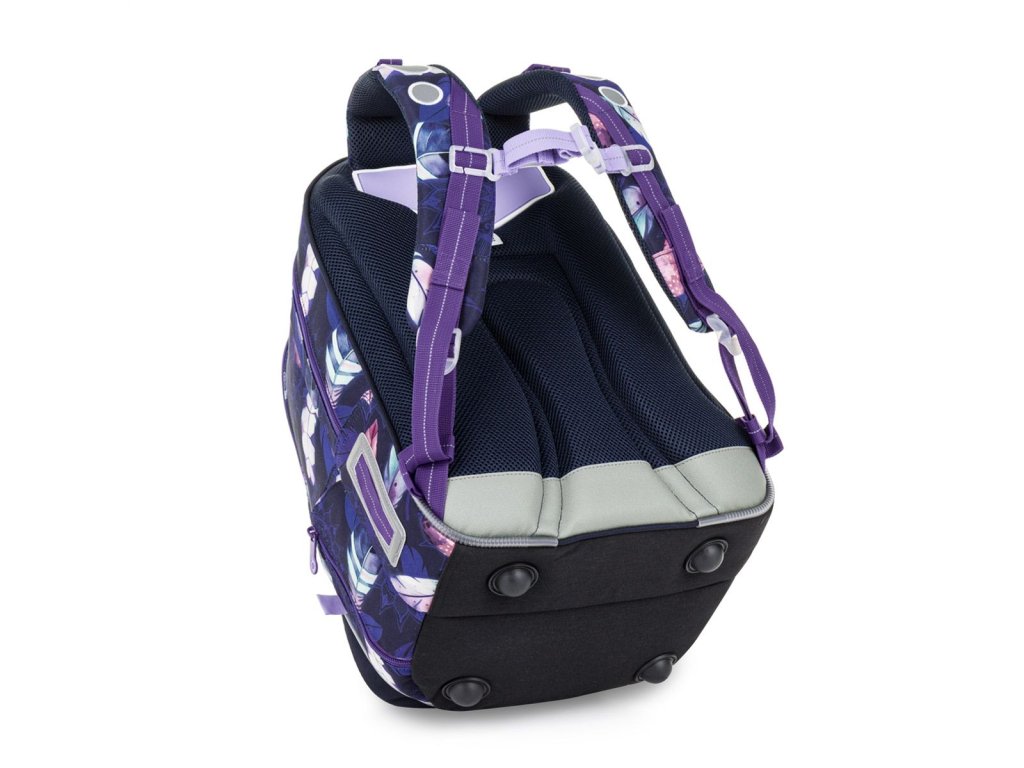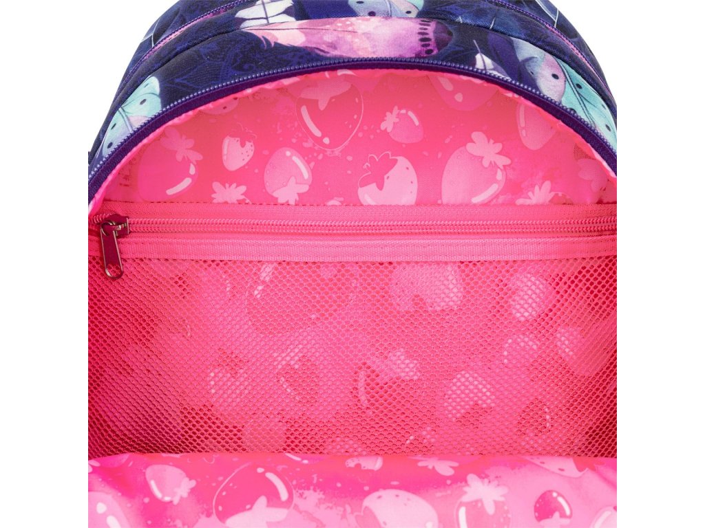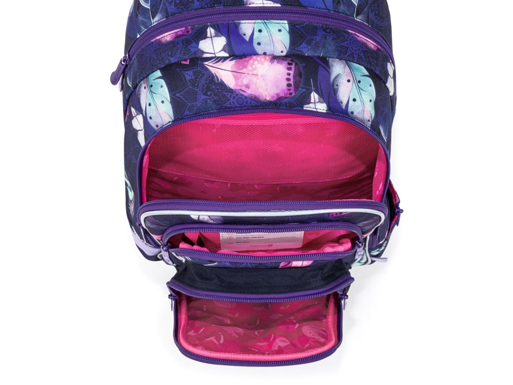 Zadní komora batohu je užší. Je ideální na přenášení nejtěžších učebnic nebo desek na sešity. Přední komora je nejširší a najdete v ní praktickou síťovou kapsičku na zip. Hluboká kapsa mezi přední komorou a kapsou na čele batohu má užší vstup, skvěle se hodí pro penál PENN 25007 ve stejném designu.