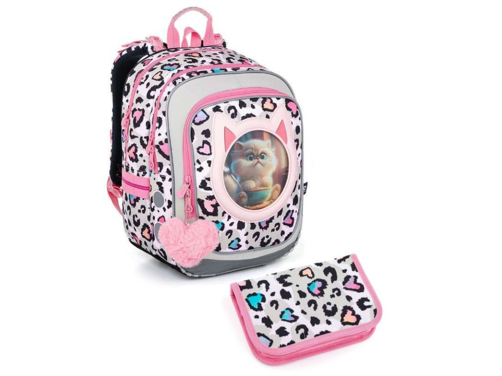 Lehký dvoukomorový školní batoh Topgal nejen pro drobné prvňáčky pro malé motorkáře. V průhledné přední kapse jsou 4 obrázky kočiček na výměnu