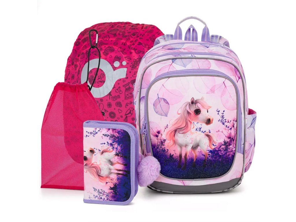- Školní set obsahuje batoh, penál, růžový sáček na cvičky a růžovou pláštěnku na batoh
