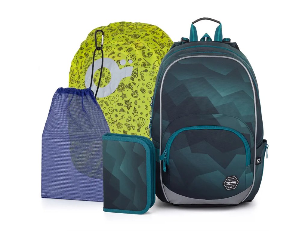 - Školní set obsahuje batoh, penál, modrý sáček na cvičky a zelenou pláštěnku na batoh