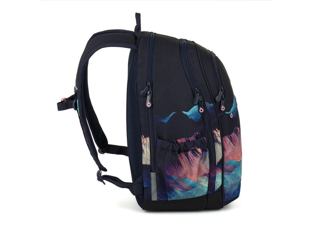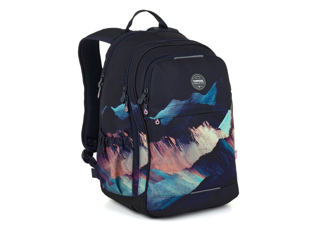 Černý studentský batoh s motivem hor je vhodný pro studenty s výškou od 145 cm.