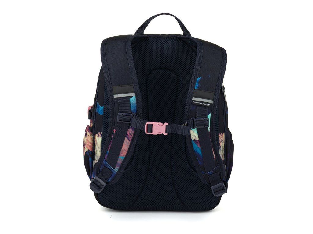 Kromě dvou hlavních komor má batoh dvě přední kapsy, do kterých se krásně vejde ETUE ve stejném designu nebo svačinový box. Do prostřední komory jsme umístili síťovanou kapsu na doklady a karabinu na klíče. Postranní kapsy na lahev jsou vyrobeny ze stejného materiálu jako batoh (perfektně udrží 1,5 litrovou láhev) a reflexní prvky nenarušují celkový vzhled batohu.