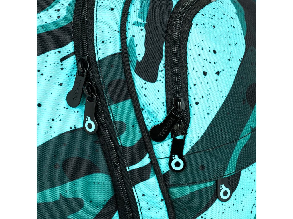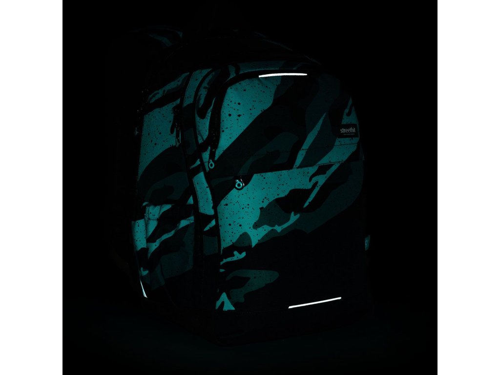 Objemný žíhaný zelenomodrý dvoukomorový batoh. Záda batohu jsou polstrovaná, anatomicky tvarovaná a pevná díky lehké hliníkové výztuze. Uvnitř zadní komory najdete polstrovanou kapsu na notebook i tablet, v druhé komoře kapsičku na zip a karabinu na klíče. Doladit lze s etue ve stejném designu.