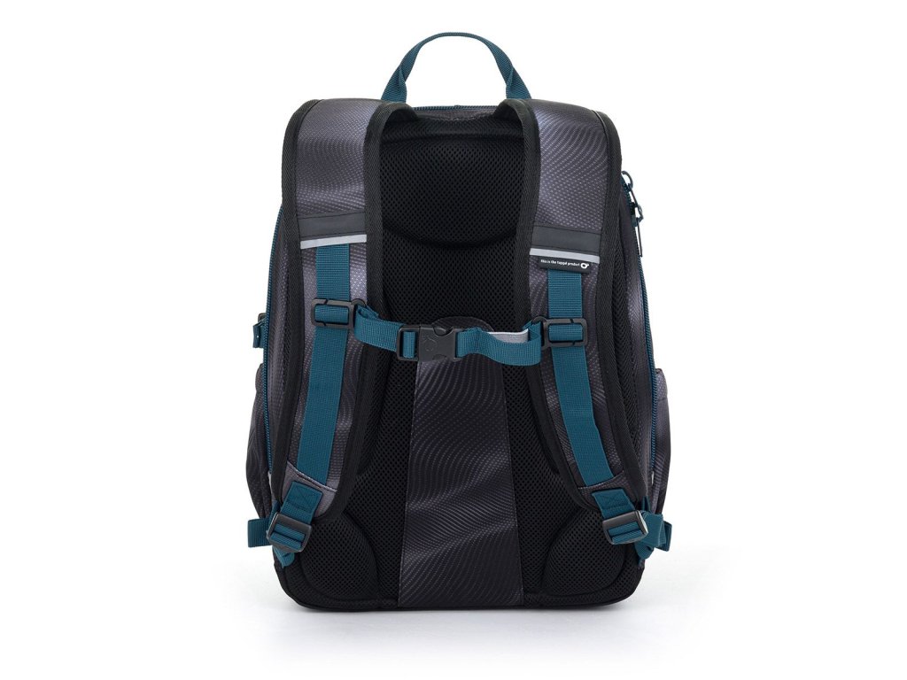 Tmavomodrý studentský batoh s tmavě modrým žíháním pro studenty od 145 cm. Batoh má dvě komory, propracovaný zádový systém a stylovou nášivku