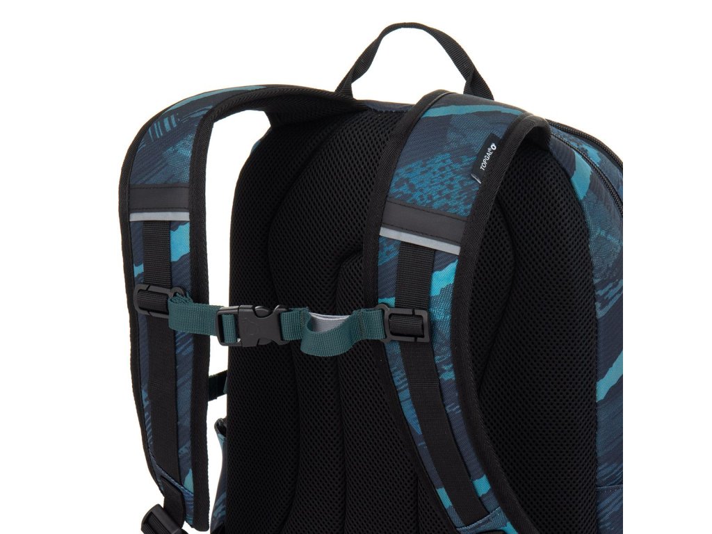 Záda batohu jsou anatomicky tvarovaná z měkké pěny. V zadní komoře je polstrovaná kapsa na notebook a síťovaná kapsa na zip. Přední komora obsahuje klíčenku. Vpředu najdete tři praktické kapsy – horní je polstrovaná (např. na mobil), spodní kapsa pojme i svačinový box nebo pouzdro ETUE 25078 ve stejném stylu. Boční kapsy z pevného materiálu udrží i 1,5l láhev.