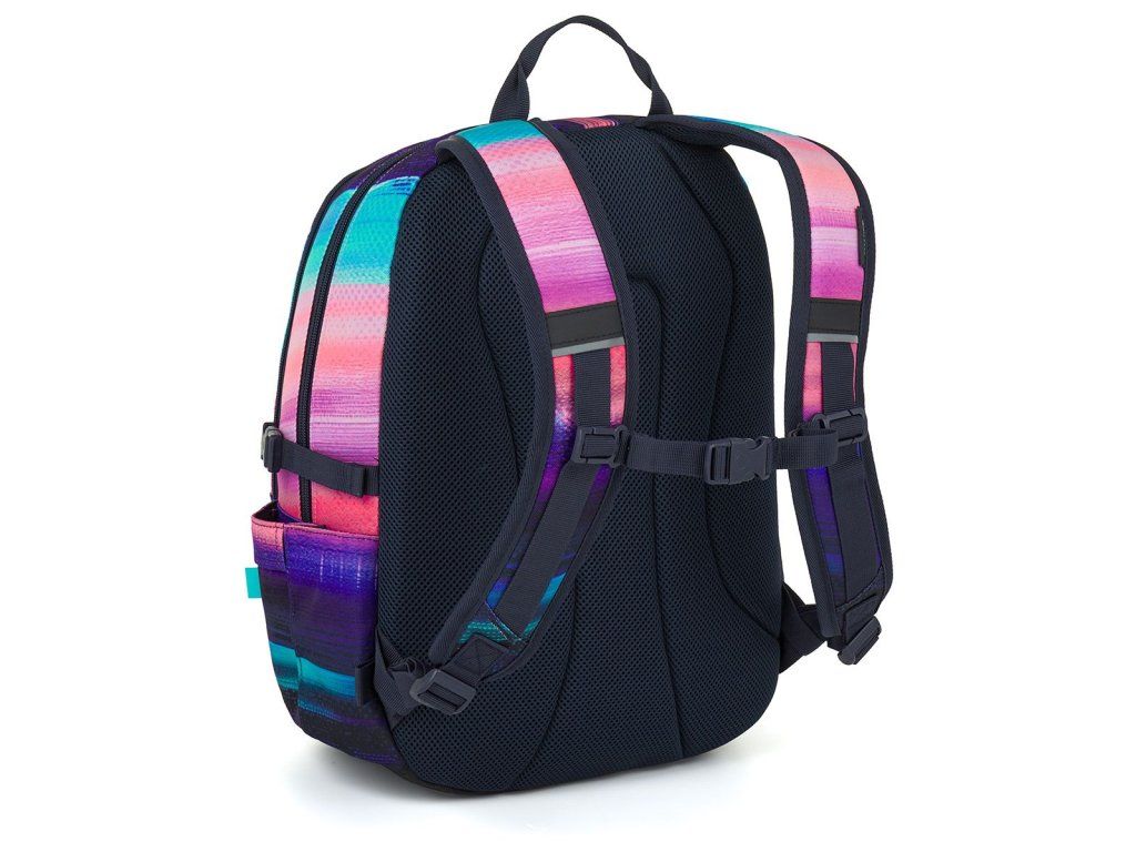 Záda batohu jsou anatomicky tvarovaná z měkké pěny. V zadní komoře je polstrovaná kapsa na notebook a síťovaná kapsa na zip. Přední komora obsahuje klíčenku. Vpředu najdete tři praktické kapsy – horní je polstrovaná (např. na mobil), spodní kapsa pojme i svačinový box nebo pouzdro ETUE ve stejném stylu. Boční kapsy z pevného materiálu udrží i 1,5l láhev.